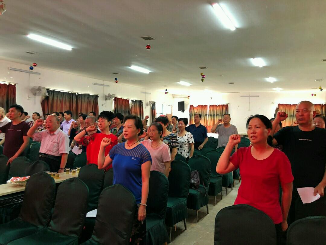 “我志愿加入中国共产党,拥护党的纲领,遵守党的章程……”离退休党员干部在党支部书记唐文敏的带领下,面对鲜红的党旗,全体起立,举起右手庄严宣誓,重温入党时的铮铮誓言,不忘入党初心。